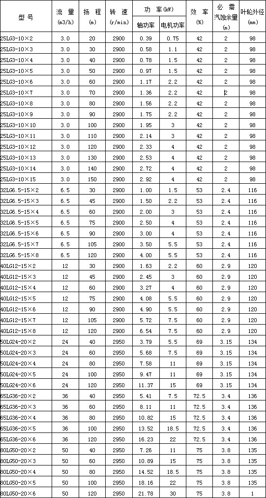 六、LG型高層建筑給水離心泵性能參數: